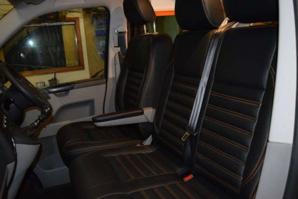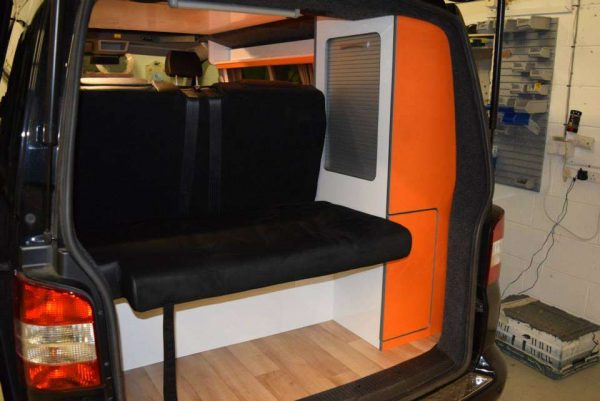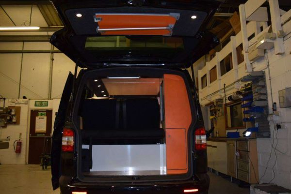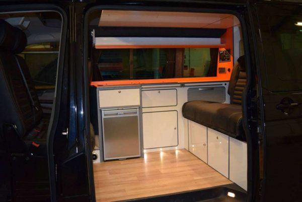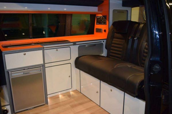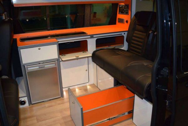 Full conversion with gloss white units and orange worktop and wardrobe sides. To complete the two tone effect, orange shelving too! RIB 112 and seats trimmed by our upholsterer in black leather with orange detailing. Popular extras such as shelf, L shape kitchen and drawer plus the all important diesel heater! We hope you like it.
