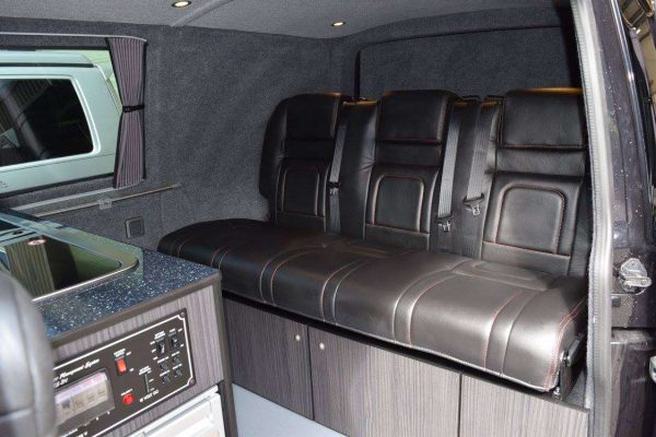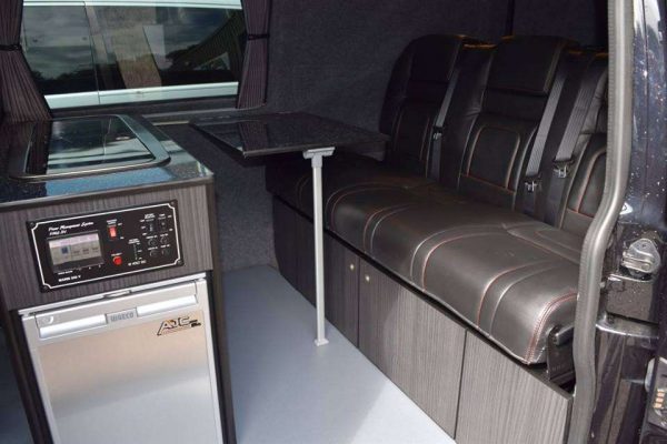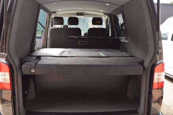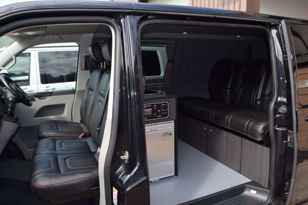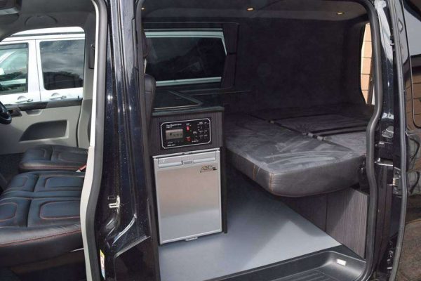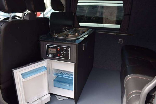 HomeGalleryT5 150cm RIB Bed & Compact Kitchen Conversion T5 150cm RIB Bed & Compact Kitchen Conversion Hacienda Black units, full width 150cm Leather RIB bed. The compact kitchen still managed to house a CR50 fridge, Smev 9222 2 burner hob and sink. Plus storage too! Gallery