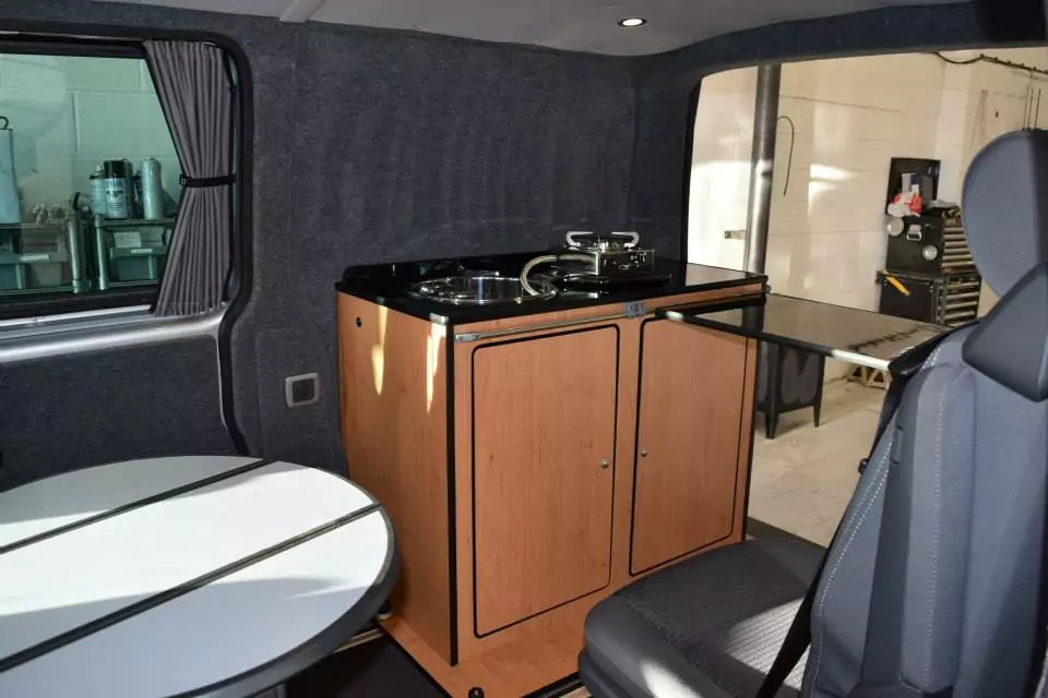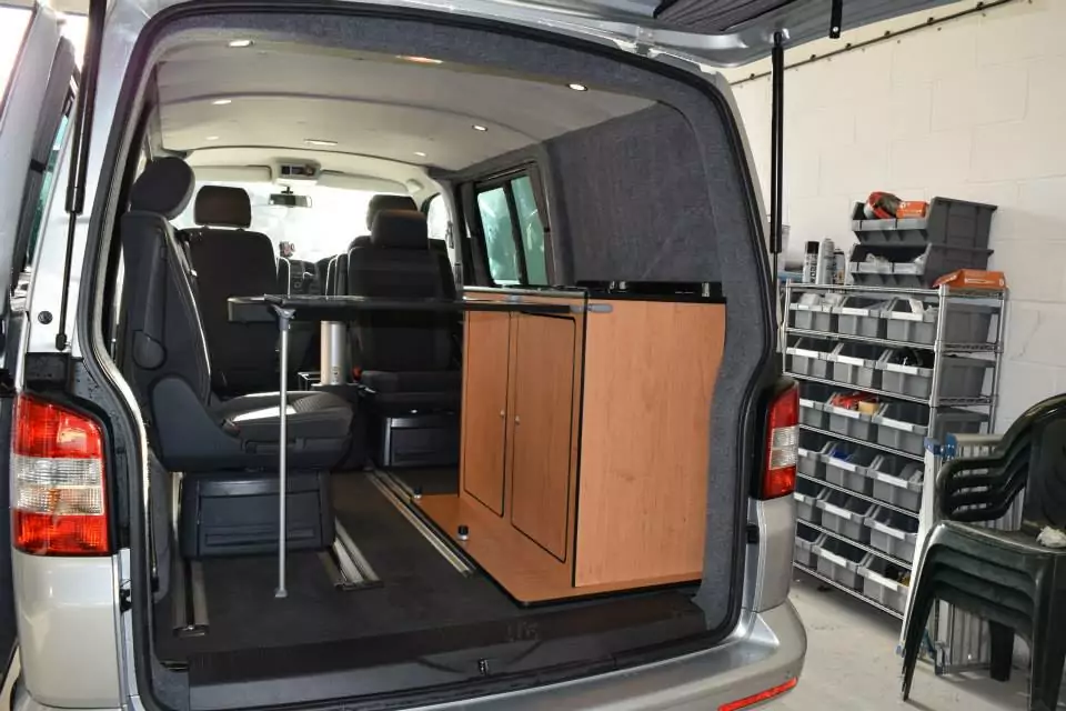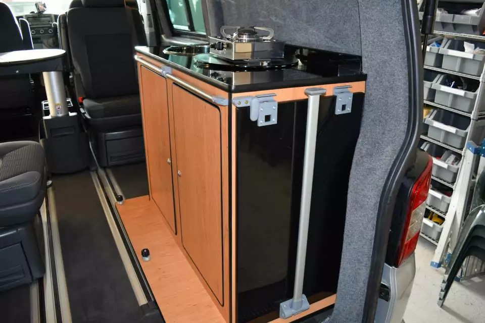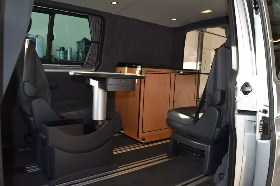 This part-conversion on a T5 Caravelle consisted of carpet lining in smoke; insulation; lesuire battery and split charge running 6 x led lights; a couple of 12v sockets; and water pump for the sink in the pod. The pod clips into the caravelle rails so is fully secure whilst being removable!