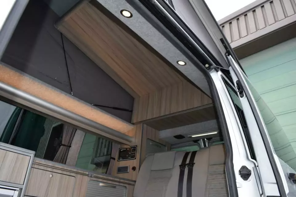 Full conversion. Driftwood units with L shape kitchen and draw with Puntinella worktop. Silver carpet lining and cream floor. Spec includes Reimo roof with 100w solar panel. Rib bed in Place trim to match the front captain swivel seats which will be home to 2 x leisure batteries. Webasto diesel heater, extra USB and 240v sockets.