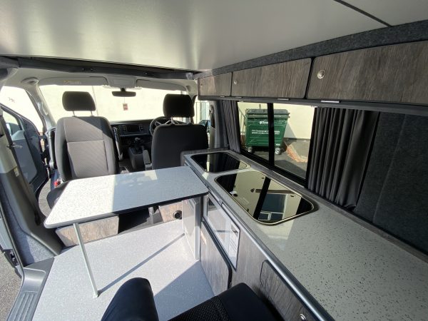 Fridge, 2 ring hob & sink, Microwave, Jerry can for water usage, Reimo pop up Roof, Power Management System including 12v power supply. 110a leisure battery, including heavy duty split charge relay, 240v mains hook up, 12v socket, Sliding table rail system, including table in matching Superva ply, Gas bottle, 4 berth, RIB Bed, Overhead shelf x 2 Plugs and USB ports, Heater, Curtains, Fiamma Awning